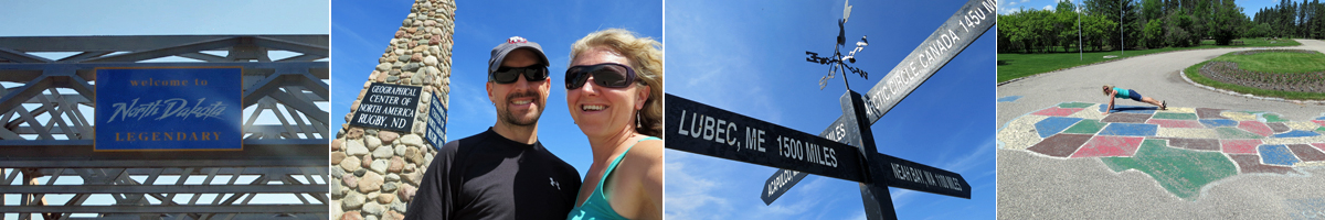 Reaching State #48-North Dakota (L to R): Crossing the Red River; taking in the, um, sights…at the Geographical Center of North America; and “planking” across my final three states.