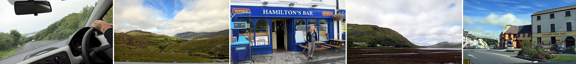 Thursday’s travels (L to R): Driving on the “wrong” side of the road; scenic views along N59; my namesake pub; Killary Harbour at Leenane; and the town of Westport.