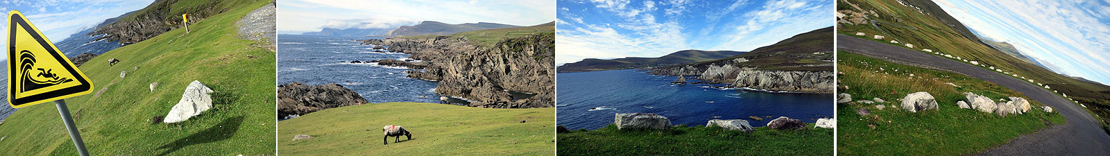 L to R: The scary outcome of falling over a cliff into the Atlantic; a lone grazer and a spectacular view; more of the view from the Atlantic Road; the “Corkscrew Road” (part of the course) winding down into the distance.