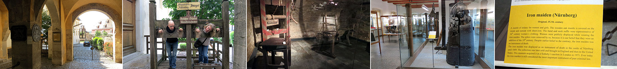 L to R: Outside the Criminal Museum; J and me in “The Stocks;” Assorted torture devices; The “Iron Maiden” and its accompanying description.
