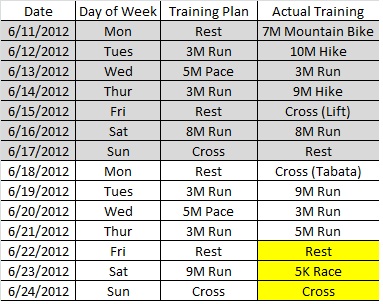 I moved my long run up this week because we’re running a 5K race on Saturday (part of our goal of running a race per month in 2012). I also substituted some hikes for runs in Week 1 because we were in the White Mountains and the weather was fantastic. I was comfortable with these adjustments in the early weeks of the plan, since the mileage is in my comfort zone of 15 to 25 miles per week. As the plan continues, I need to buckle down. Given the demands of the plan, I don’t want to risk injury due to over-training . Also, since the plan is designed to provide enough rest leading into the longest run of the week and enough recovery after, it’s important that I stick to the prescribed schedule to avoid getting hurt or falling short on the important long training runs.