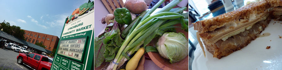 After the race, which had an early 8 AM start, we did a quick change of clothes at the car (tucked into a shady spot in a free parking garage) and walked several blocks down Main Street to the Lynchburg Community Market. We planned to fill a bag with fresh local produce, but first things first…specifically, breakfast. We assumed the long line at Barb’s Dream Hut inside the marketplace was a good sign, so we ordered veggie omelets and shared a side of hash browns. We also ended up sharing our table with a local couple in their late 70s. They were newlyweds, having just tied the knot last December, although their first date was actually 63 years earlier, before he introduced her to his best friend…whom she subsequently married. It was a sweet story and part of a lovely conversation.